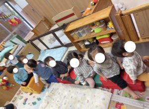 4月にすくすく組になった1番小さいクラスだった子どもたちも、お友達や先生、園生活の流れを知り、色んな玩具に触れて、色んな所へお散歩に出かけ、毎日多くのことを感じ取り、世界を広げてきました。お友達との関わりを通して遊び方にも広がりが見られるようになってきています。今回はすくすく組さんになる直前の3月の“見立て遊びを楽しんだ時間”について書き留めたいと思います。