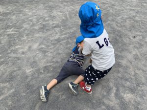 泣いてしまうかなと様子を見ているとB君はA君が近寄ってきたことに気付き、ニコッと笑いまた走り出しました。走り終えると、「もう1回やる!」と線のところまで戻っていき、A君とB君のかけっこは数回続きました。