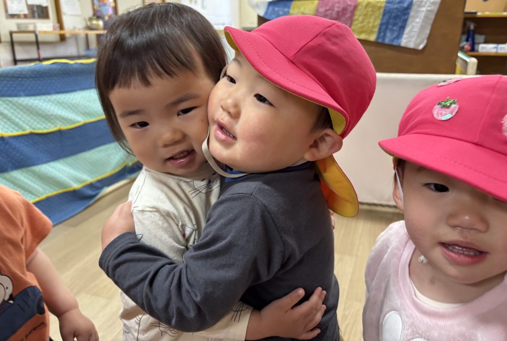 そんな中で見られたお友だち同士のぎゅっとしたハグの姿。始めはAちゃんとBちゃんがハグをしていてその後、周りにいたCくんもAちゃんにハグをしていました。実はBちゃんとCくんがAちゃんと会うのは初めてでした。思わず心が温かくなり、春らしく、微笑ましい一場面でした。こうした触れ合いは「愛着形成」を促し、安心感や信頼感を育む大切な関わりです。保育者との関係だけでなく、お友だち同士で自然に関わろうとする姿は「社会性の発達」や「対人関係の形成」の芽生えともいえます。また、ハグによって気持ちが満たされることで情緒の安定に繋がり、自分の気持ちを安心して表現できるようになります。こうした経験は「情動調整」の力を育み、相手の気持ちに気づく力や共感性の発達にも繋がっていきます。